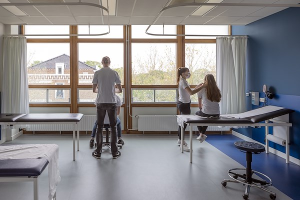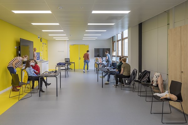 Studenten ontmoeten elkaar in het hele gebouw: toevallig bij de koffiebar of op de tribunetrap, of tijdens een les of praktijksimulatie, legt het architectenbureau uit. Ook ontmoeten studenten en professionals uit het werkveld elkaar door de symposia in het auditorium of trainingen in een van de congres- en vergaderzalen.