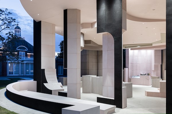 . Het paviljoen is gevormd door fragmenten van bestaande en verdwenen ontmoetingsplaatsen in Londen.