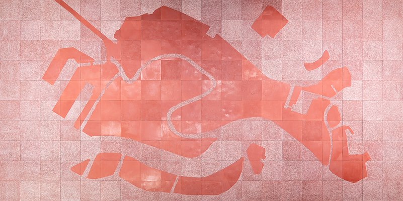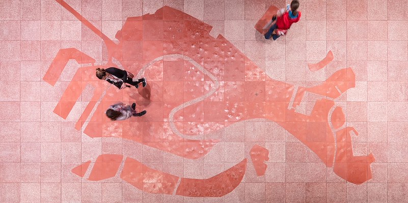 tot stand is gekomen, behelst een terrazzovloer met daarop een afbeelding van de stadsplattegrond van Venetië. Als bezoekers iets te onvoorzichtig op een tegel stappen, dan breekt deze.