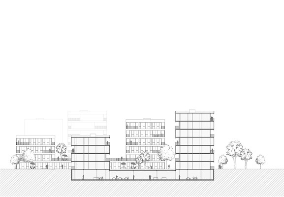 In de plint komen op de begane grond gemeenschappelijke voorzieningen, zoals een gedeelde eetkamer en een kinderdagverblijf. Verder geven sportvoorzieningen invulling aan het idee van een vitale woonwijk.