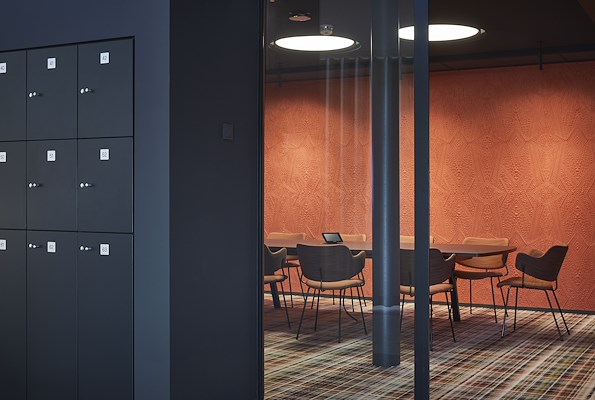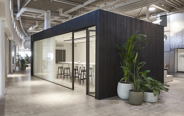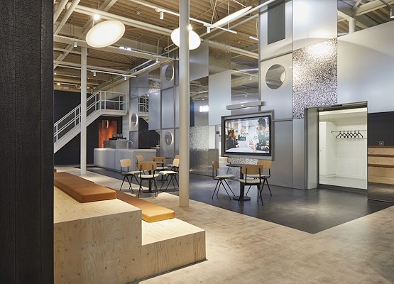Een tweede ontmoetingsplein met bar, elders op de afdeling gesitueerd, biedt ook mogelijkheden voor presentaties. Het openbare gebied ademt ‘tech’ met een combinatie van materialen als metaal en beton, legt Ex Interiors uit. Installaties zijn in het zicht gelaten om technologiesfeer te versterken.