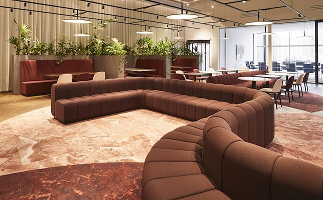 Terwijl het kantoorlandschap strak is gehouden, kenmerkt het ontmoetingsgebied zich door een warmere uitstraling met een eikenhouten vloer en grote karpetten met marmertekening. Ontmoetingsnisjes, lange banken in warme roodtinten, verdiepingshoge gordijnen en de vele planten verstreken een huiselijke sfeer.