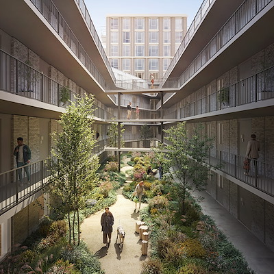 Daartussen zorgen twee lagere wanden aan het plein voor een behapbare stedelijke korrel, met een gelaagde bakstenen gevel. Aan het geluidsluwe hof erachter hebben bewoners toegang tot hun woning. Deze besloten tuin kenmerkt zich door rust, verkoeling en groen, stelt het architectenbureau.