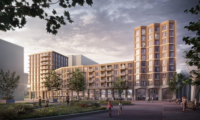 Vanaf het plein leiden twee riante entrees naar de woningen, vertelt LEVS. Het woonprogramma beslaat 15.000 m