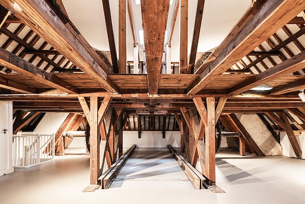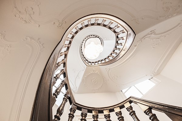 Om de monumentale ornamenten, architraven en vlakverdelingen goed tot hun recht te laten komen, heeft het architectenbureau gewerkt met verschillende tinten grijs en wit. De grijstinten verwijzen naar de periode waarin de zusters het pand bewoonden en alles grijs geschilderd hadden. De nieuw ingebrachte elementen, zoals de glazen wanden en pantry’s, hebben om het verschil tussen oud en nieuw te benadrukken een juist strakke vormgeving en een mat zwarte afwerking.
