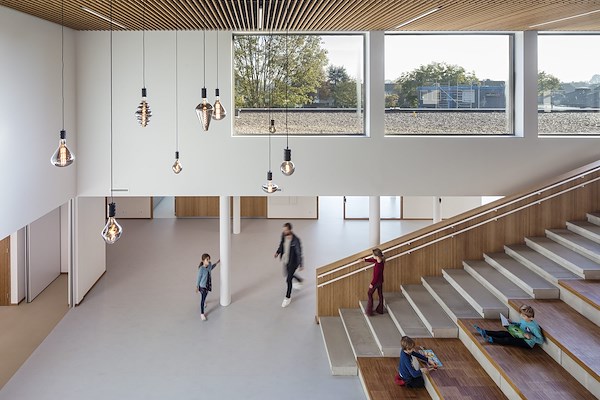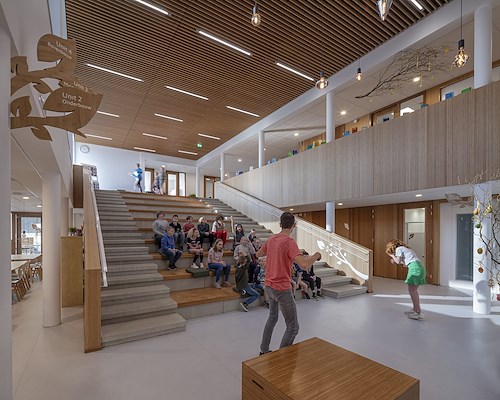 Onderaan de trap bevindt zich de open leeromgeving voor de onderbouw. In de luwte achter de trap hebben de jongsten van het kinderdagverblijf en peuterspeelzaal hun plek. Doordat de eerste verdieping kleiner is dan de begane grond grenzen er ramen aan het atrium, die direct daglicht in het interieur toelaten.