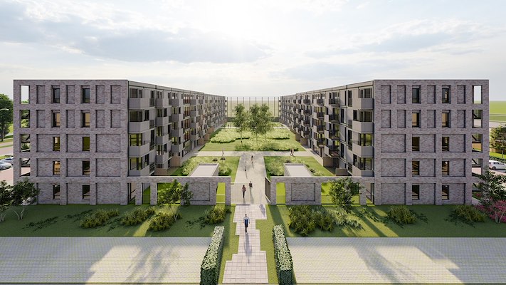De woongebouwen zijn volledig demontabel, herbruikbaar, verplaatsbaar en opnieuw in te delen, indien gewenst. De gevel wordt opgetrokken uit een circulair gevelsysteem en glas, meldt Finch Buildings. Tussen de twee bouwblokken komt een gemeenschappelijke binnentuin.