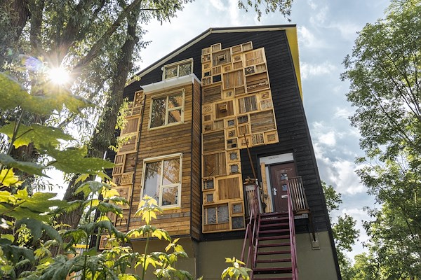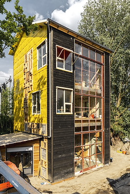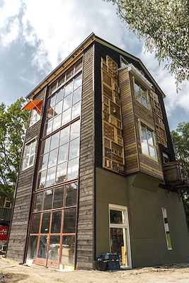 in Utrecht geopend. Het zestien meter hoge gebouw, dat plaats biedt aan een collectief van jonge gamedesigners en een ontmoetingsruimte voor ondernemers, is voor 99 procent gebouwd van hergebruikte materialen. Daaronder oude dienstregelingsplaten van de NS, maar ook een raam uit een afgebroken gebouw in de Halve Maan-buurt.