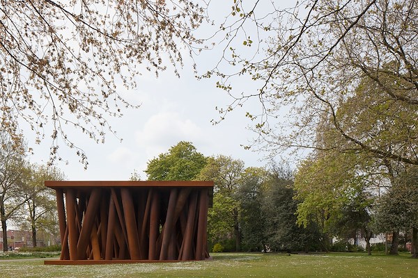 De kolommen doen ook denken aan een zuilengalerij, maar door hun plaatsing – schuin en kriskras door elkaar – ontstaat ook de associatie met omgevallen bomen in een dicht woud. “We denken even te weten wat het is, maar het is zo veel meer”, zegt Gijs Van Vaerenbergh. “De constructie refereert aan iets herkenbaars, maar ontkracht dat meteen.”