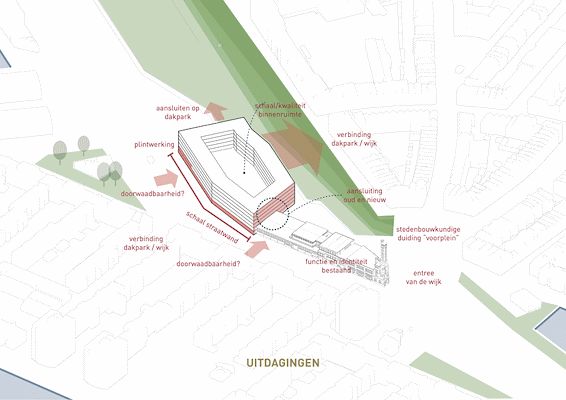 Het ontwerpteam voor het project bestaat uit diederendirrix architecten, IWT, Atelier Tomas Dirrix en DELVA Landscape Architecture / Urbanism. Om de plek, die is gelegen tussen zeer uiteenlopende stedelijke structuren, meer body te geven is gekozen voor een stevig nieuwbouwblok. Dit kadert de grenzen van het plangebied duidelijk af en introduceert enkele nieuwe stedelijke ruimtes, verklaren de architecten. Aan de Pelgrimsstraat wordt de rooilijn van de bestaande gebouwen voortgezet.