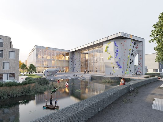 Het bijbehorende plein aan het water wordt een belangrijke ontmoetingsplek voor de buurt, waar ook evenementen en wedstrijden georganiseerd kunnen worden. Een publieke voetgangersroute verbindt het plein, dwars door het gebouw heen, met de toegangswegen van de wijk, meldt WRK Architecten. De klimwereld wordt zo nog meer onderdeel van de openbare ruimte.