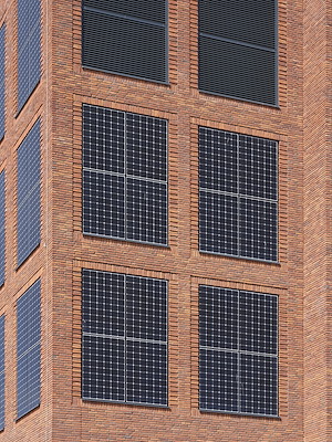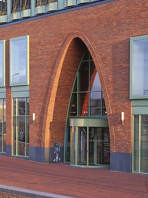 De gevel is opgetrokken in gedetailleerd metselwerk, gecombineerd met grijsgroene stalen frames. De dubbelgekromde erker en de driehoekige bloemkozijnen zijn ingezet om de relatie tussen en binnen en buiten te versterken. De ingangen van de bibliotheek en parkeergarage zijn geaccentueerd met grote entreebogen.