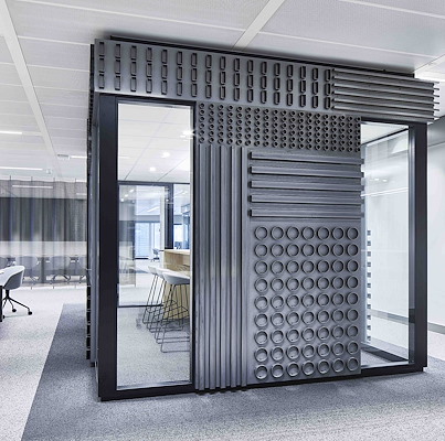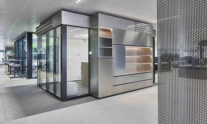 Na de kantoorvleugels zijn als laatste fase van de verbouwing en herinrichting de entree en de directievleugel onder handen genomen. Bij de inrichting van het gehele interieur zijn metaal- en aluminiumproducten toegepast in de vorm van akoestische scheidingen, wanden en presentaties, vertelt M+R.
