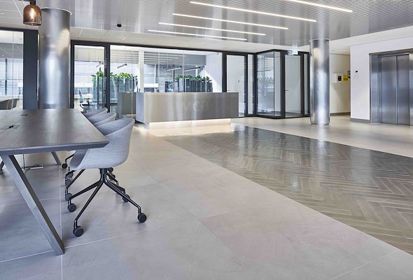 Een nieuwe transparante draaideur vormt de entree. Vanaf hier leidt een opvallende vloer de werknemers en bezoekers naar de receptie; als een baan liggen hier stalen stroken in een visgraatmotief.