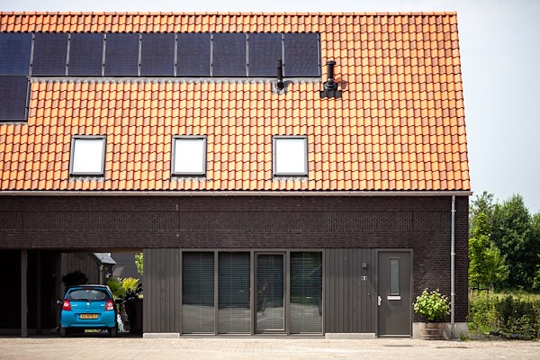 Bakstenen schuren omsluiten het erf. Grote terug liggende puien zorgen voor een geleidelijke overgang tussen de privéwoning en het openbare erf enerzijds en de private tuin en open landschap anderzijds, meldt Pauwert Architectuur.