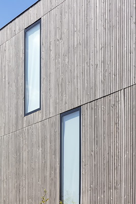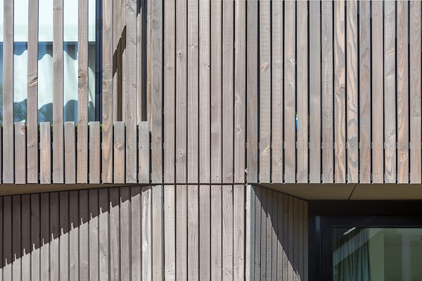 De gevels zijn zorgvuldig gedetailleerd en voorzien van vergrijst Douglas-hout, dat in losse planken is gemonteerd. “Dit geeft de woning een verfijnde, natuurlijke uitstraling en geeft het hout tegelijkertijd voldoende ruimte om te drogen na een regenbui, wat de levensduur verlengt”, legt 8A uit.