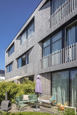 De houten delen zijn doorgezet bij de loggia’s en Franse balkons, waar ze de semi-open balustrade vormen door om en om delen weg te laten. De uitlijning van de houten delen is per bouwlaag zo ontworpen, dat de drie verdiepingen duidelijk in de gevel zijn te lezen.