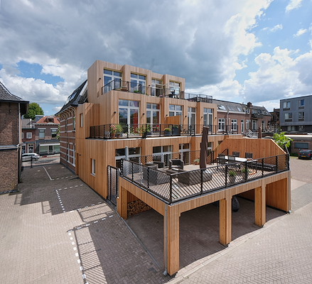 Verder naar achteren ligt de Zonnehof, een park waar het gebouw op uitkijkt. Door de riante terrassen op de houten volumes en de carport maakt het pand een verbinding met de groenere omgeving, legt Schoots Architecten uit.