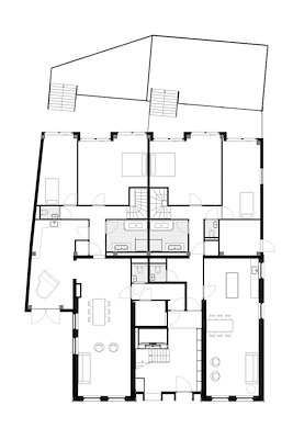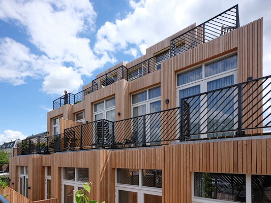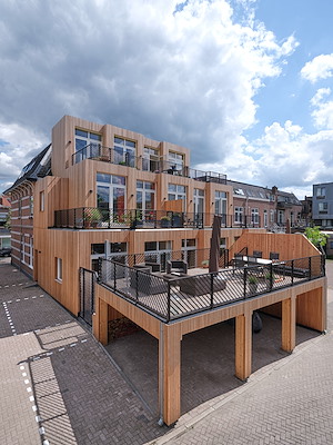 De aanbouw aan de achterzijde draagt bij aan de grote vrijheid voor de nieuwe bewoners om hun huis naar eigen wens in te richten, legt Schoots Architecten uit. Elke woning is uniek in vorm en is ruimtelijk door de hoge plafonds. Door een slimme stapeling van elementen zijn de appartementen voorzien van ruime terrassen.