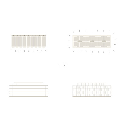 Vanwege de dicht bebouwde omgeving was het belangrijk voldoende daglicht op de lagere verdiepingen en straatniveau te behouden. Daartoe zijn de appartementen op de bovenste verdiepingen zijn telkens iets terug geplaatst.