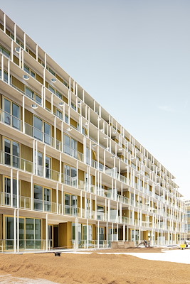 De balkons zijn onderdeel van een doorlopende buitenruimte rondom het gebouw. Met hun expressief vormgegeven plafonds lijken de balkons een voortzetting van het interieur. De buitenruimten zijn verticaal verbonden door een fijn gevelraster, dat als een voile het gebouw omvat.