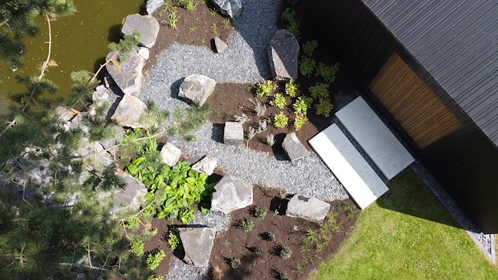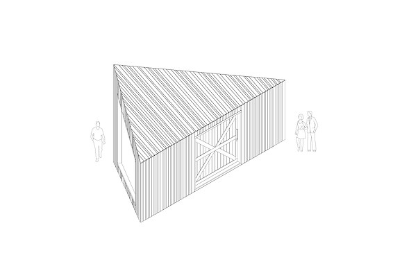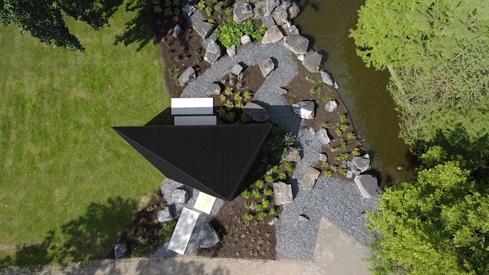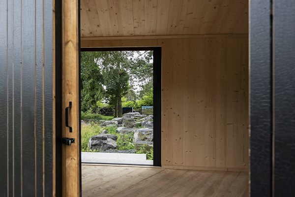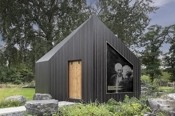 Aan de buitenzijde van de gevels is het hout verduurzaamd met shou-sugi-ban, de van oorsprong Japanse techniek om de toplaag te verbranden. De zwarte uitstraling contrasteert net de binnenzijde van het paviljoen, die is bekleed met lariks. In een van de gevels is een glasplaat met een portret van Jaap en Aleid Rensen opgenomen.