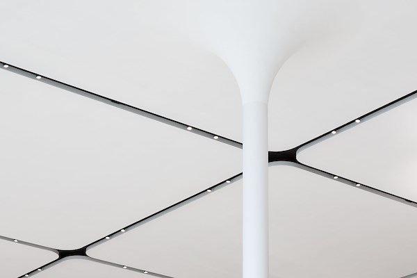 De nieuwe entree sluit op een zachte manier aan op het bestaande gebouw, dat wordt gekenmerkt door zware betonstructuren. “De expressieve getande vorm van de nieuwe luifel, is gebaseerd op het stramien van het gebouw. De kenmerkende betonnen kolommen zijn in een soort raster gebouwd, wij wilden daarop aanhaken”, zegt Kellerhuis.