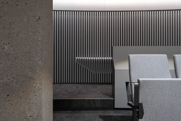 Als een ‘plug-in’ is het bestaande perenhouten meubilair van de Tweede Kamer (naar ontwerp van Pi de Bruijn) hergebruikt en ingepast in de beschikbare ruimte. Dankzij het lichte interieur, in combinatie met het dakraam, heeft de zaal een frisse uitstraling. Met de geometrische vormen van onder meer het dakraam en de balustrade is tevens weer een verbinding gelegd met de architectuur van het gebouw. De ruwe betonnen kolommen in de zaal zijn in hun originele staat gelaten om het contrast te vergroten.