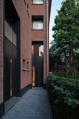 Daarnaast heeft elke woning aan de andere zijde van het blok een eigen voordeur. Het architectenbureau heeft deze voordeuren eenzelfde status willen geven als de dubbele deuren met bovenlicht van de bestaande schoolentree. Daarom zijn de puien ruim 4,5 meter hoog, met ‘bovenlichten’ die daglicht op de eerste verdieping brengen.