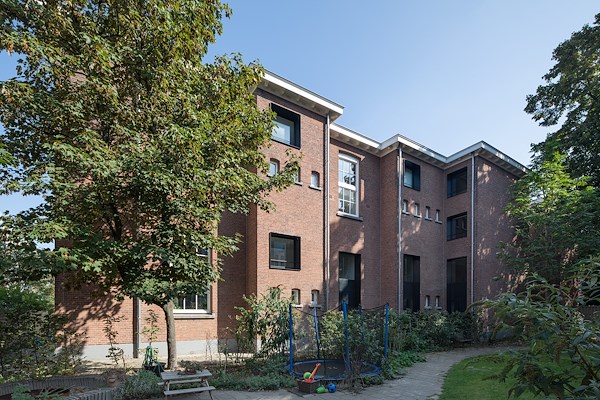 Doordat één van de vier oorspronkelijk schoolgebouwen op het binnenterrein is gesloopt, was er ruimte voor privétuinen en een besloten collectieve binnentuin. De woningen hebben openslaande deuren naar de tuinen, waartoe de borstweringen van de ramen op de begane grond zijn weggebroken.