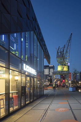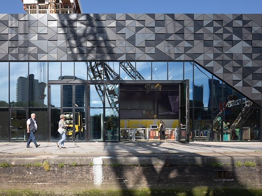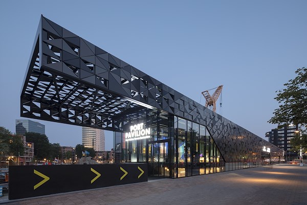 Daarnaast is het paviljoen van staal, aluminium en glas op ooghoogte (en op strategische plaatsen) transparant gemaakt, zodat de activiteiten binnen vanaf de kaden en het water van de haven zichtbaar zijn.