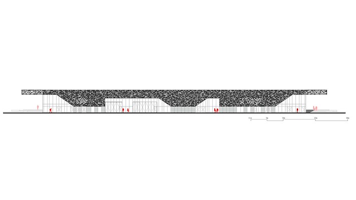 Het gebouw mocht net als de oude paviljoens slechts acht meter breed worden. Daarom heeft het architectenbureau een langgerekt volume ontworpen dat zich uitstrekt en parallel loopt met de Schiedamsedijk en de kade. Wel neemt het gebouw minder lengte in beslag dan de drie eerdere paviljoens, waardoor van vanaf de Schiedamsedijk meer uitzicht op de Leuvehaven is.