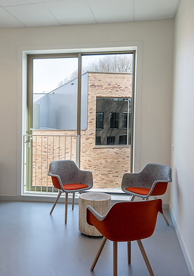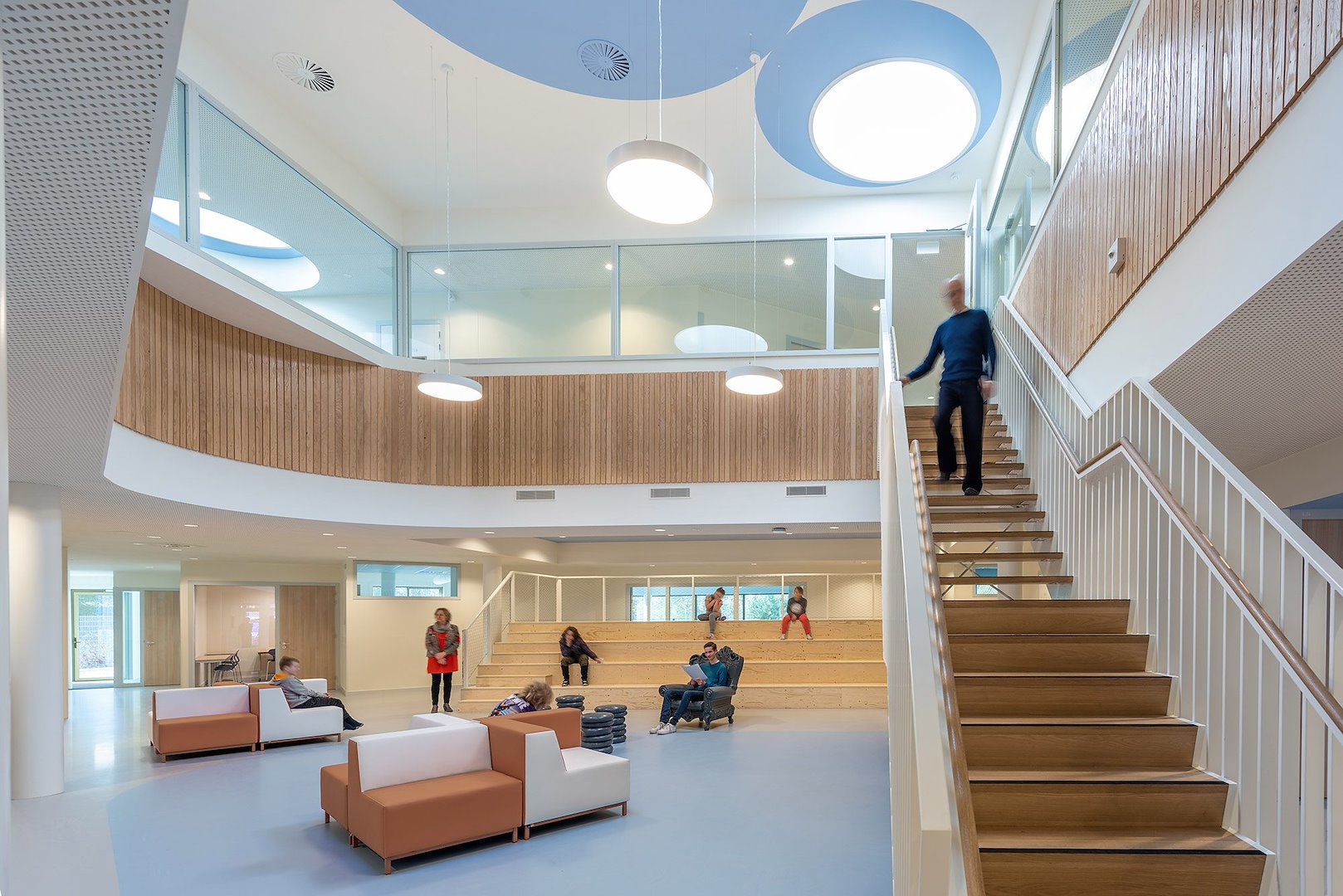 Met het oog op de voor deze leerlingen gewenste kleinschaligheid zijn twee ontmoetingsruimten, de aula en de kantine, aan de uiteinden van een ‘verbindingsstraat’ in het gebouw geplaatst. De kantine is lunch-, ontspannings- en praktijkruimte ineen. De voor mensen uit de wijk toegankelijke ruimtes liggen op strategische plekken in de school.