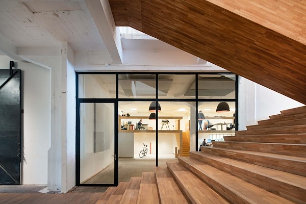 Een monumentale houten trap, gerealiseerd in een ruimte die tevens plek biedt voor ontmoeting, lezingen en exposities, vormt het hart van het pand. Het eikenhout van de trap biedt samen met onder meer de ranke zwart stalen puien en balustrades een contrast met het beton waaruit het monument bestaat.