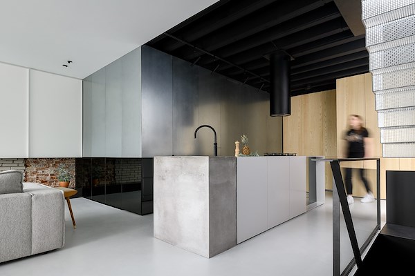 Om van een oude zolder in de Amsterdamse Pijp een leefruimte te maken verhoogde de vorige eigenaar het dak zo'n vijftig centimeter. Hierna is het als renovatieobject verkocht aan de huidige eigenaar, die Firm architects opdracht gaf er een bijzondere woning met zo groot mogelijke gebruiksoppervlakte van te maken. Het nieuwe deel op de oude basis heeft het architectenbureau als uitgangspunt voor het ontwerp genomen. De gehele ruimte is horizontaal ‘doorgesneden’ op een hoogte van 95 centimeter. Om de ruimte zo groot mogelijk te laten lijken, heeft Firm architects één volume in de ruimte geplaatst, dat afgezien van de leefruimte en de hoofdslaapkamer alle functionaliteiten herbergt.