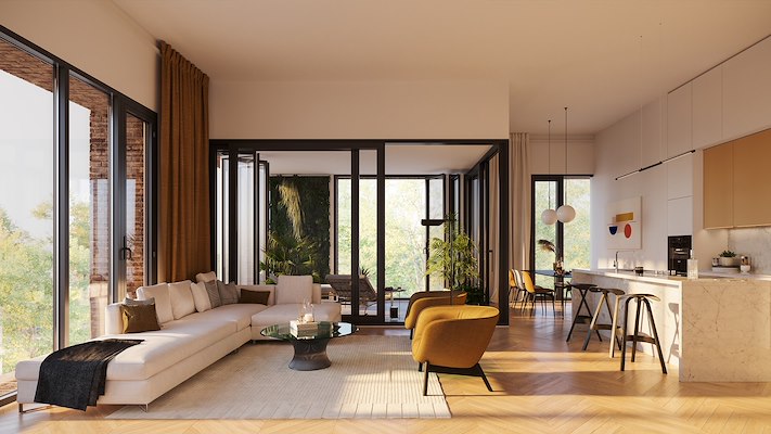 Verder kunnen de bewoners de stalen schermen laten begroeien, zodat er een aangename groene binnenwereld ontstaat, als contrast met de bakstenen buitenzijde.