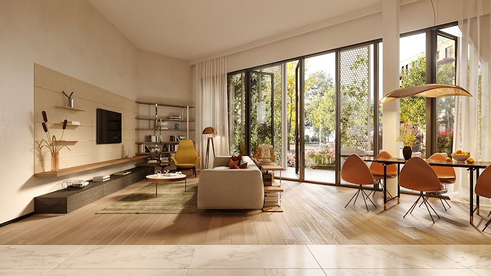 De buitenruimten bij de gevel in de snede fungeert tevens als zonwering, legt EVA uit. Daarnaast wil het architectenbureau hier groen integreren, “eveneens een idee van Quist.”