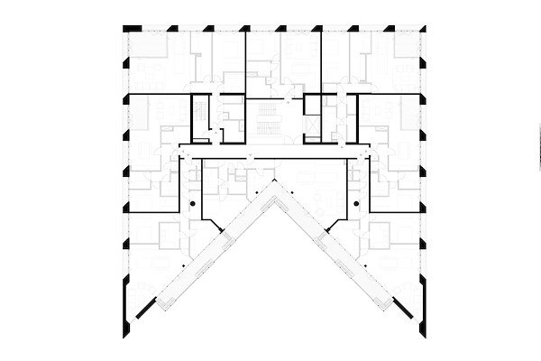 De vorm van het gebouw en de hoogte van de verdiepingen – bijna vier meter – bieden volgens EVA mogelijkheden voor ruime, bijzondere appartementen. Bij de nieuwe indeling plaatst het bureau de ondersteunende functies rond de kernen en de leefruimten zoveel mogelijk aan de gevel. Dit resulteert in een grote diversiteit aan appartementen: 23 types op 39 woningen, variërend in grootte van 60 tot 150 m2. Vooral de scherpe hoeken resulteren in bijzondere typologieën en plattegronden.