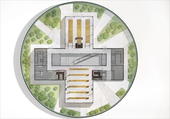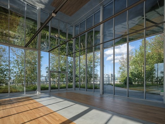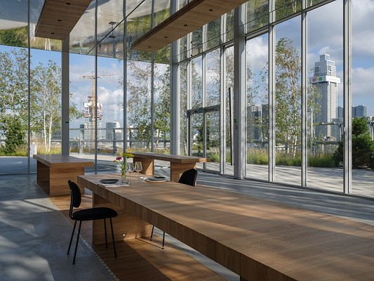 Beide ruimtes zijn ondergebracht in het glazen paviljoen op de dakverdieping en bieden uitzicht op de door MVRDV (tevens architect van het gebouw) en MTD Landschapsarchitecten ontworpen daktuin. De opgave voor concrete was om een flexibel café-restaurant en zaal te ontwerpen in een paviljoen waarvan het ontwerp al voor 99 procent was vastgelegd.