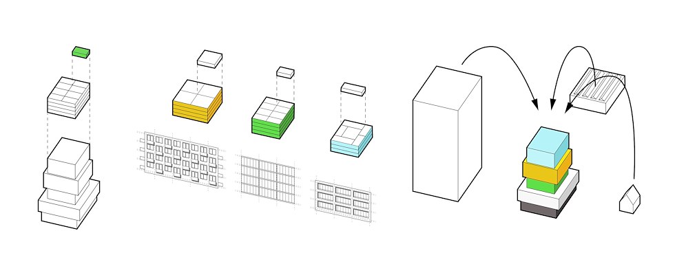 De architecten hebben het geïnterpreteerd als de aanwezigheid van een tussenschaal; die verenigt de menselijke maat van de woning met de grotere schaal van het gehele gebouw – dat weer aansluit bij de schaal van de bestaande bebouwing in infrastructuur. Zodoende is TPDVSP gekomen tot een stapeling van vijf verschillend vormgegeven blokken, of woonloodsen.