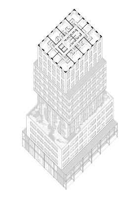 De gestapelde volumes vormen samen een eigenzinnige toren, waarbij de blokken onderling verschillen in afmetingen, overstekken, dakvlakken en materiaalgebruik. De vormgeving van de afzonderlijke volumes volgt indirect uit het programma van eisen van de opdrachtgever, Woningstichting Eigen Haard.