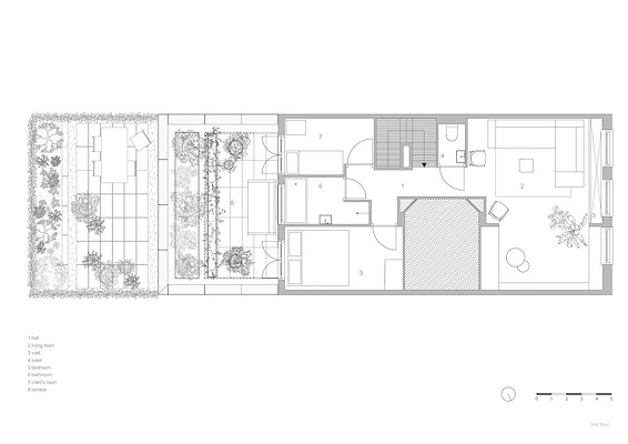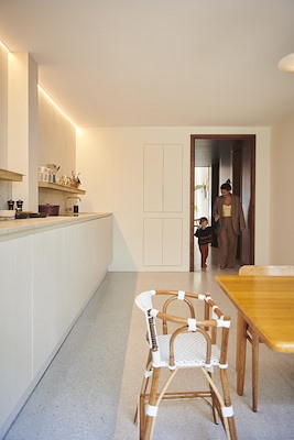 Door deze indeling ontstaat een prettige sequentie van ruimten en ervaren de bewoners de overgangen van licht naar donker en van donker naar licht, legt Spee uit. De ervaring van licht wordt aan de voorzijde van het huis nog eens vergroot door de realisatie van een smalle vide, die bovendien het voormalige beneden- en bovenhuis visueel verbindt.
