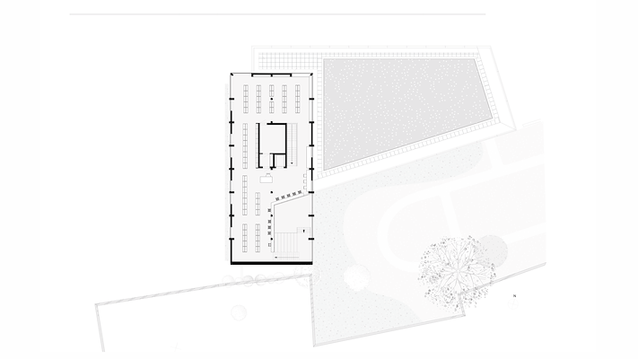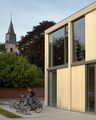 Het gebouw is gerealiseerd met een prefab constructie uit CLT en ontworpen met het oog op flexibiliteit, vertelt het architectenbureau. De open ruimten die nu als bibliotheek dienen, zijn indien gewenst te transformeren voor andere functies.