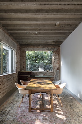 Met het strippen van het pand tot op de constructie is een prachtig gebouw tevoorschijn gekomen, waarvan de architect vervolgens de essentie en ruimtelijkheid heeft weten te behouden en benadrukken. Op knappe wijze is de gehele ruimte ingedeeld door het plaatsen van meubels, die bovendien zeer zorgvuldig uitgevoerd. Dat elk meubel in een ander materiaal is uitgevoerd, versterkt het besef dat dit objecten in de ruimte zijn.
