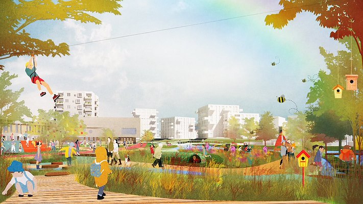 Het landschap rond het voorzieningencluster bestaat uit een mix van avontureneilanden, speelplekken en groene schoolpleinen. Verrassende doorzichten nodigen kinderen, bewoners en passanten uit op een ontdekkingsreis in de natuur, aldus de ontwerpbureaus. Het ontwerp draagt bij aan het dubbel gebruik van het landschap en aan een actieve omgeving gedurende de hele dag.