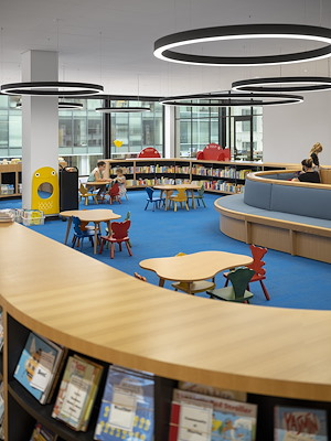 In de noordoosthoek van de begane grond is een nieuw café toegevoegd. Daarnaast beginnen vanaf het maaiveld twee nieuwe trappartijen, die met hun vloeiende vormen een zacht accent toevoegen aan de door rechte lijnen gedomineerde bibliotheek. Dat laatste geldt ook voor nieuw toegevoegde ruimtes als het auditorium (291 plaatsen) op de vierde verdieping, studie- en activiteitenruimtes in het hele gebouw en het dakpaviljoen. De kinderbibliotheek op de tweede verdieping is daarnaast van bijpassende kleuren voorzien.