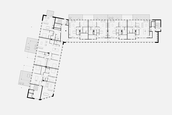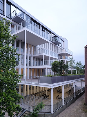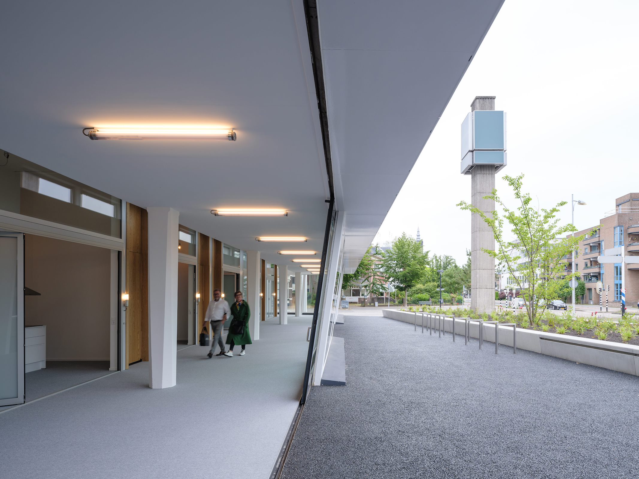 De herbestemming tot woongebouw is aangegrepen om meer verblijfskwaliteit op het voorplein te creëeren. Een groot planten- en bomenvak vormt nu een buffer voor de drukte van de Utrechtseweg. Dit komt het terras van de horeca-functie ten goede en het maakt het voorplein ook geschikt om aan te wonen. Zo heeft De Kort Van Schaik in een deel van de voormalige showroom zeven shortstay-appartementen ontworpen, die de voorruimte als gemeenschappelijke ruimte gebruiken. De grote schuifdeuren waardoor voorheen auto’s in en uit reden, zijn nu te gebruiken om de ruimte naar het voorplein open te zetten, waarmee er een nieuwe levendigheid kan ontstaan.