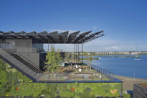 Het gebouw heeft een demontabele opzet en er zijn verschillende circulaire materialen toegepast, waaronder biocomposiet gevelbekleding, betongranulaat, hergebruikt hout voor de tribunetrappen, vlonders en buitenmeubels en gerecyclede metalstuds voor de binnenwanden. Opgevangen regenwater dient als warmte- en koelingsbuffer en voorziet in de bewatering van het groen op en aan het gebouw.