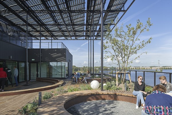 De oostzijde, gericht op de bomentuin van het Floriadeterrein, is volledig groen en kleurt mee met de seizoenen. Het groen is voortgezet op het dak, dat fungeert als verblijfsruimte en leer- en experimenteergebied. Een luifel van semi-transparante pv-panelen beschermt de studenten tegen de zon, laat BDG Architecten weten.