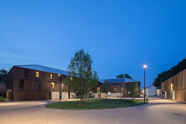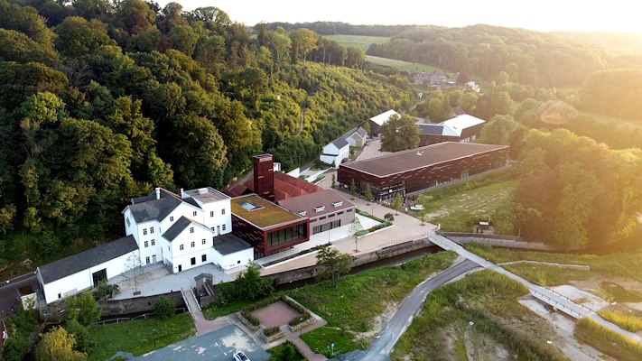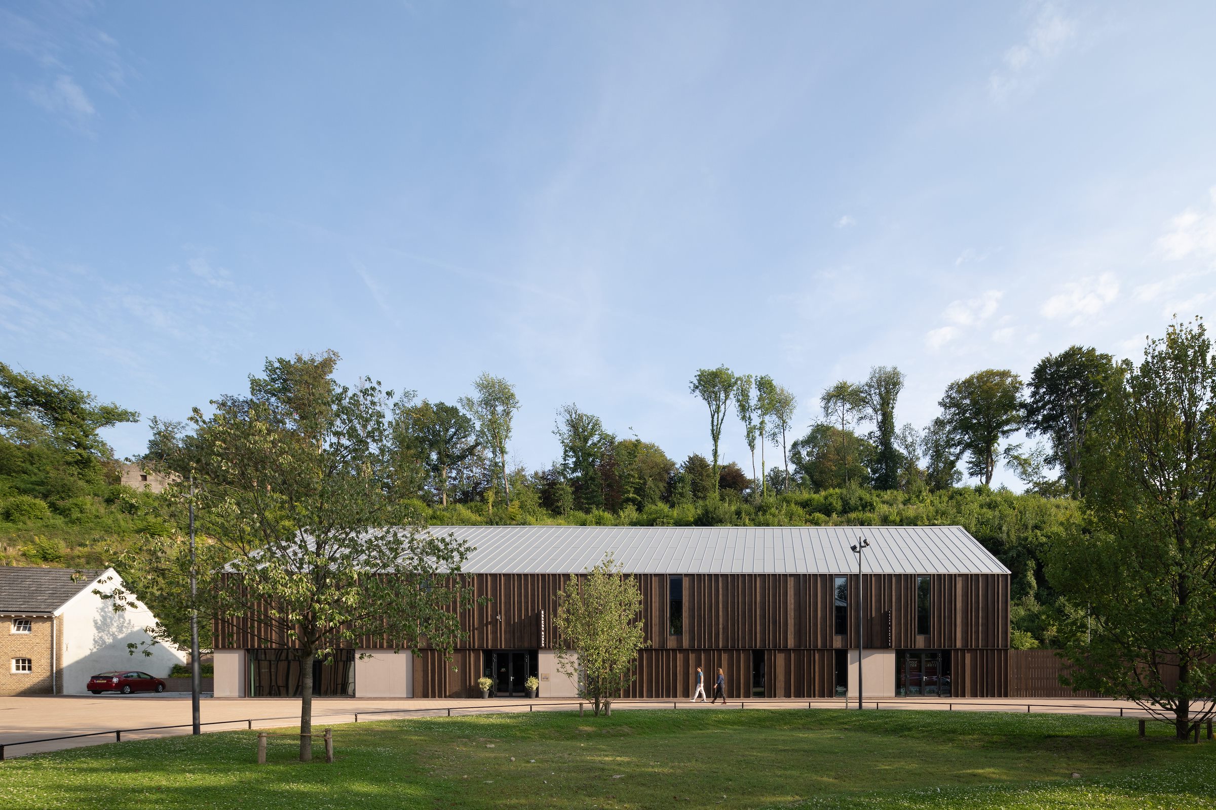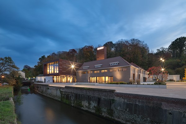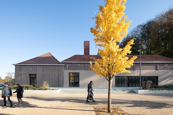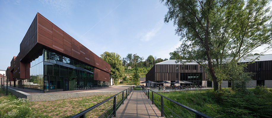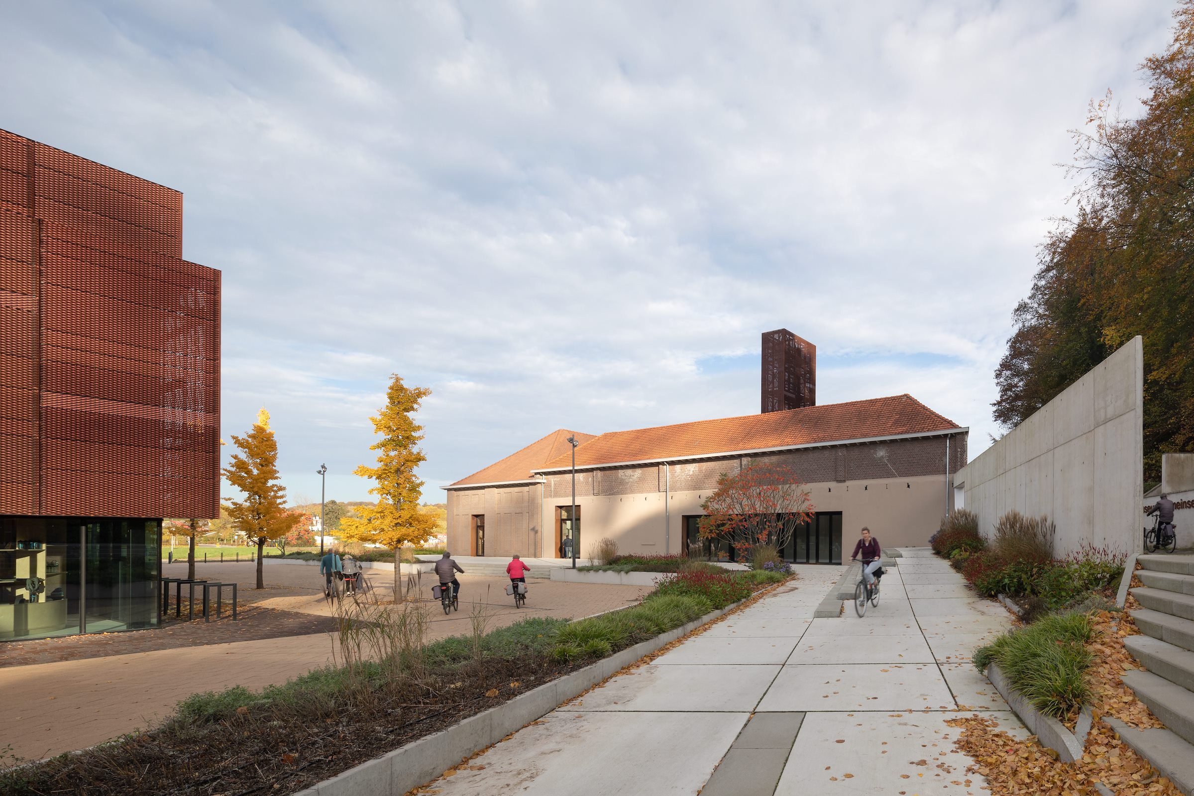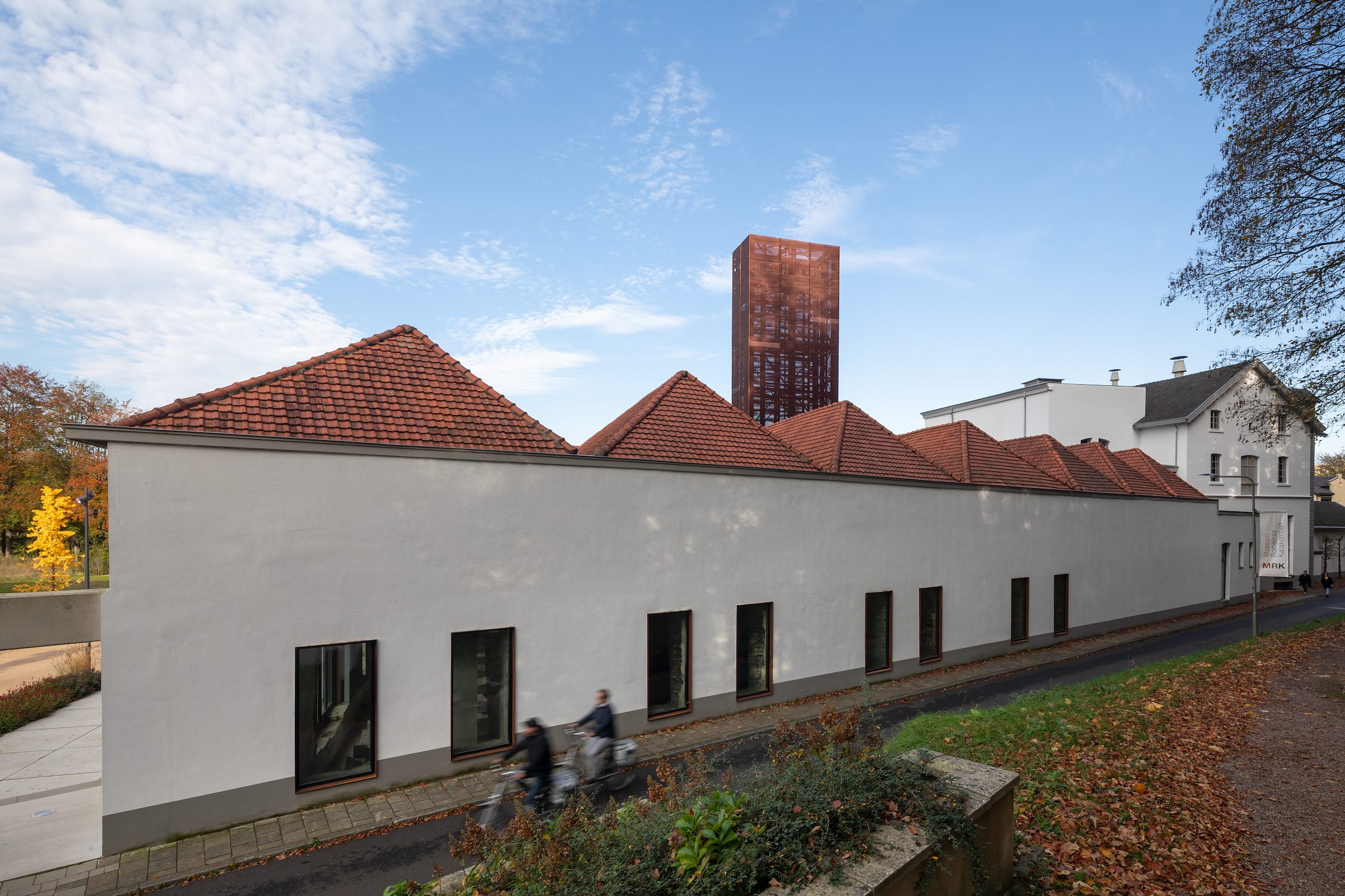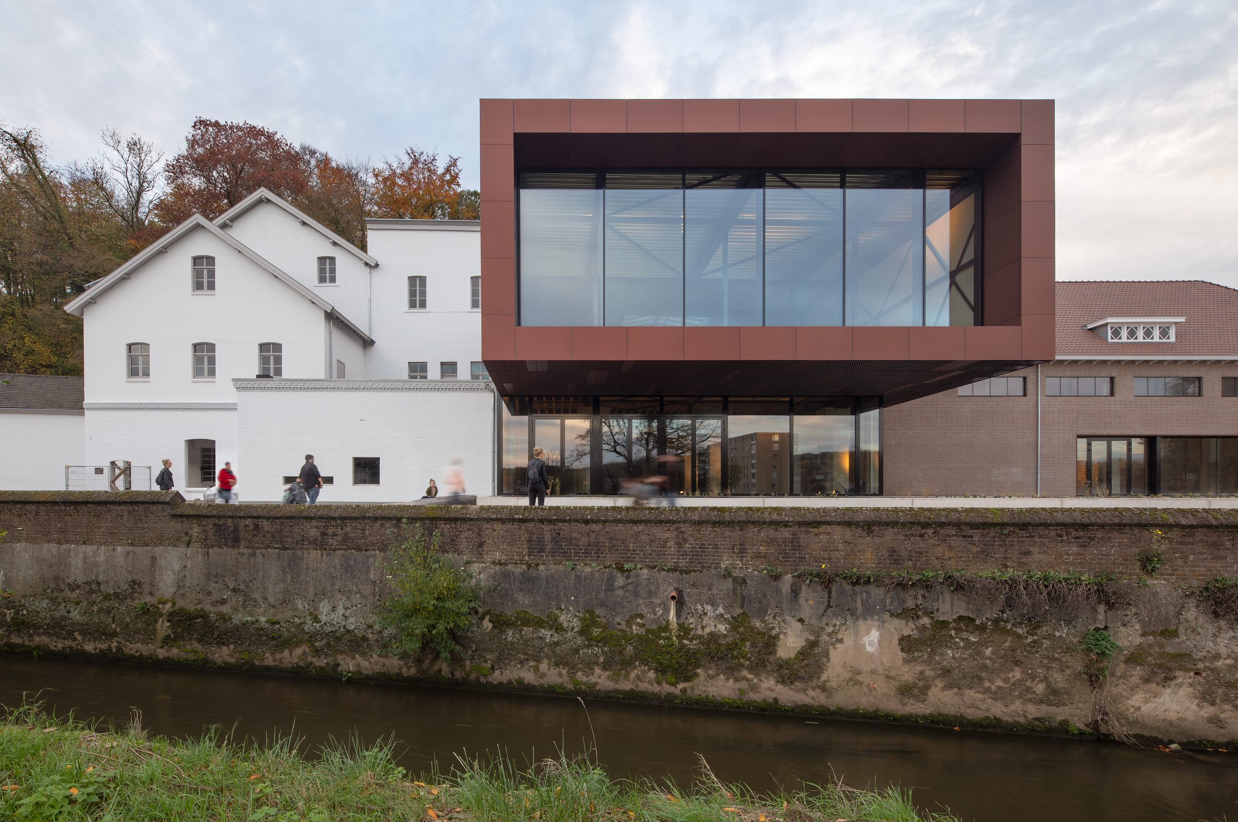 Tussen de brouwruimten en de hallen is het gebouw uitgebreid met een modern volume, dat MoederscheimMoonen op de betonnen kolomkoppen van verwijderde silo’s heeft geplaatst. De uitbreiding – voorzien van een groot venster dat zicht biedt op de meanderende Geul – vormt samen met een verticaal element een blikvanger in de omgeving. De gevel van dit nieuwe volume is bekleed met rechthoekige strekmetalen platen van geanodiseerd roodbruin aluminium. Met verschil in plaatafmetingen is een gevarieerd gevelbeeld gecreëerd; een verandering in oriëntatie van het strekmetaal op sommige plekken draagt daar verder aan bij en zorgt voor een andere daglichtreflectie. De gevelbekleding zorgt voor een relatie van het nieuwe volume met het naastgelegen Shimano Experience Center.